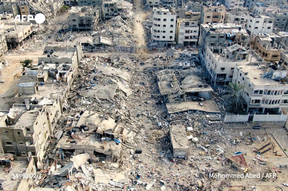 An aerial view on December 26, 2023 shows destroyed buildings in Beit Lahia following Israeli bombardments in the northern Gaza Strip. Mohammed Abed / AFP