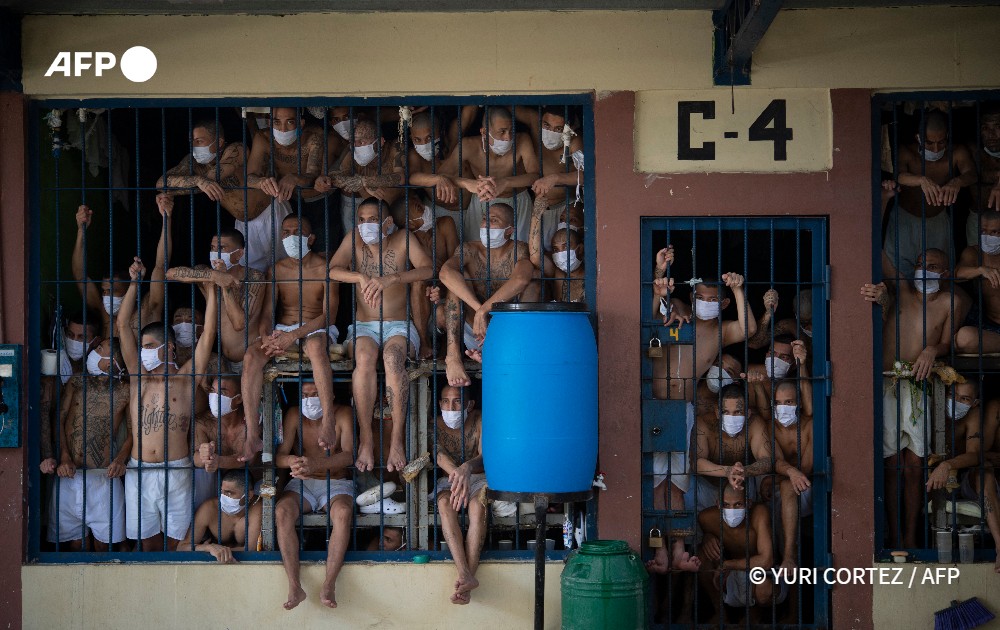 04/09/2020 - QUEZALTEPEQUE, SALVADOR - Des membres des gangs MS-13 et 18 s'entassent dans une cellule surpeuplée de la prison de Quezaltepeque. Les autorités de la Direction générale des centres pénitentiaires (DGCP) ont visité trois prisons salvadoriennes, dont certaines de très haute sécurité, pour vérifier les conditions de vie des détenus et effectuer des fouilles dans le contexte de la pandémie de coronavirus COVID-19. © Yuri CORTEZ / AFP