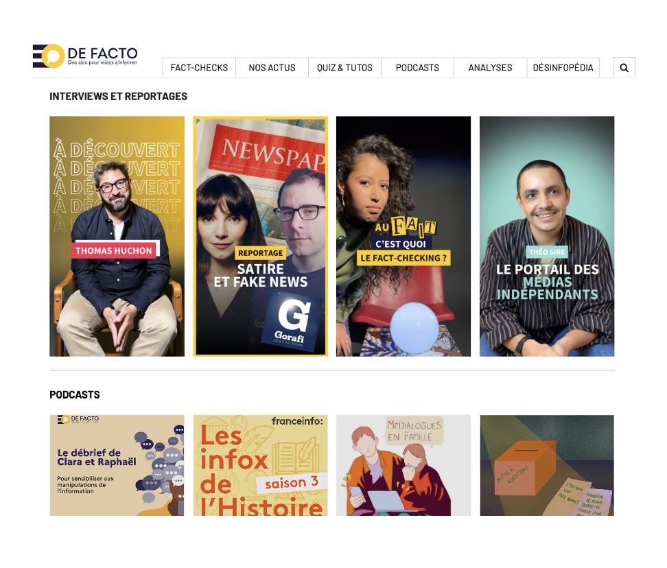 À travers de nombreux contenus et données clef, la plateforme DE FACTO permet à chacun de comprendre les enjeux actuels de la désinformation en multipliant les formats :